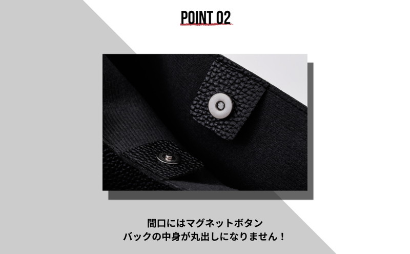 POINT 02 開口部にはマグネットボタン付き。バッグの中身が飛び出しにくい
