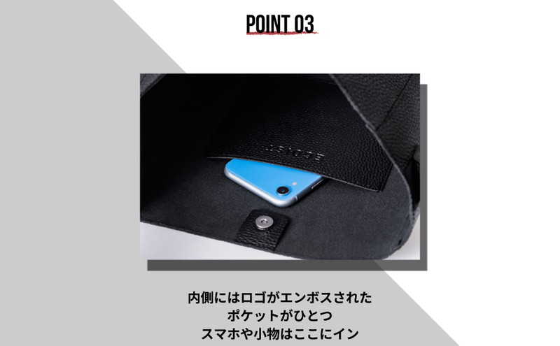 POINT 03 内側には型押しロゴ入りのポケットが1つ。スマホや小物はここにイン