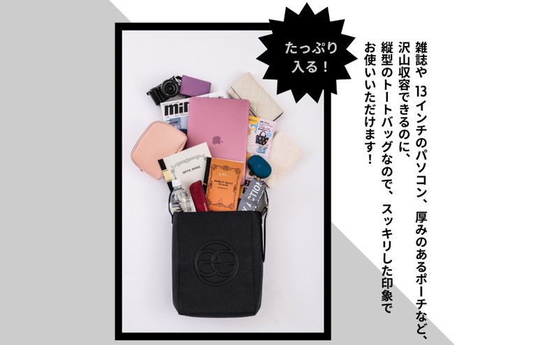 エンボス加工のEGロゴがポイントの縦型ショルダーバッグは、A4サイズも収納可能。