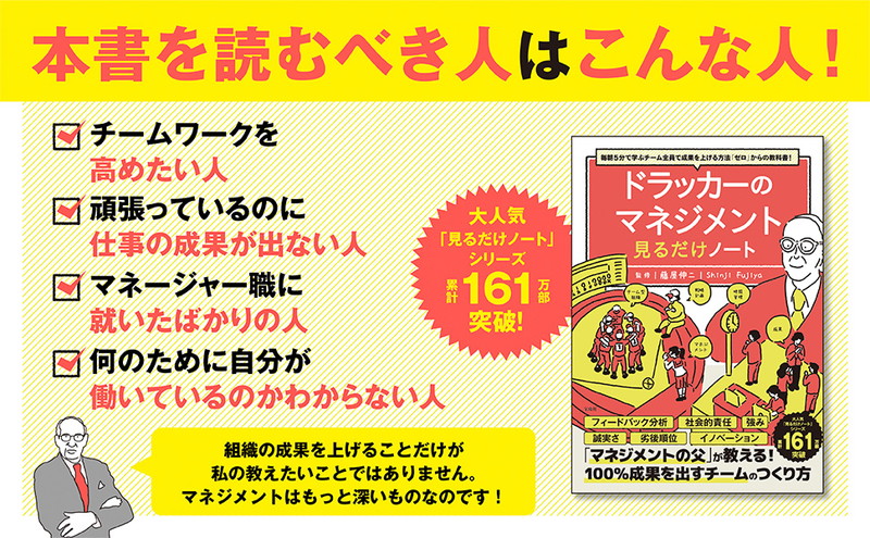 マネジメントの発明者=ピーター・ドラッカーが説くマネジメント論が「見るだけノート」シリーズに登場。成果が上がる組織のつくり方から、これからの時代に必要なマネジメント方法までをイラストでやさしく解説しています。特にチームリーダーなどマネジメントする立場の人は読んでおきたい一冊です。