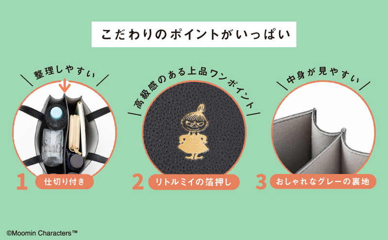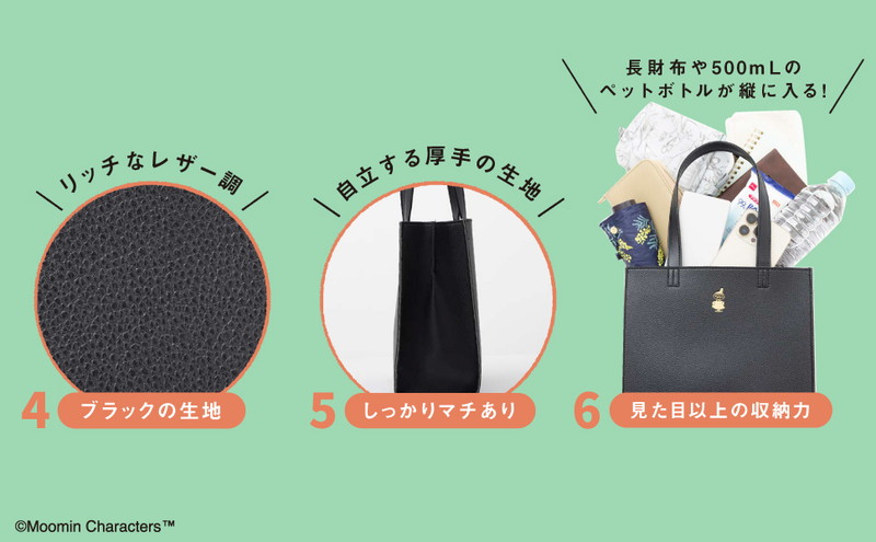 デザインは、シックなブラックのレザー調にゴールドの箔押しで高級感たっぷり。箔押しのリトルミイが大人かわいいアクセントになっています。持つだけでおしゃれ度がぐっと上がる、大人が持ちたい上品でリッチなバッグに仕上がりました。