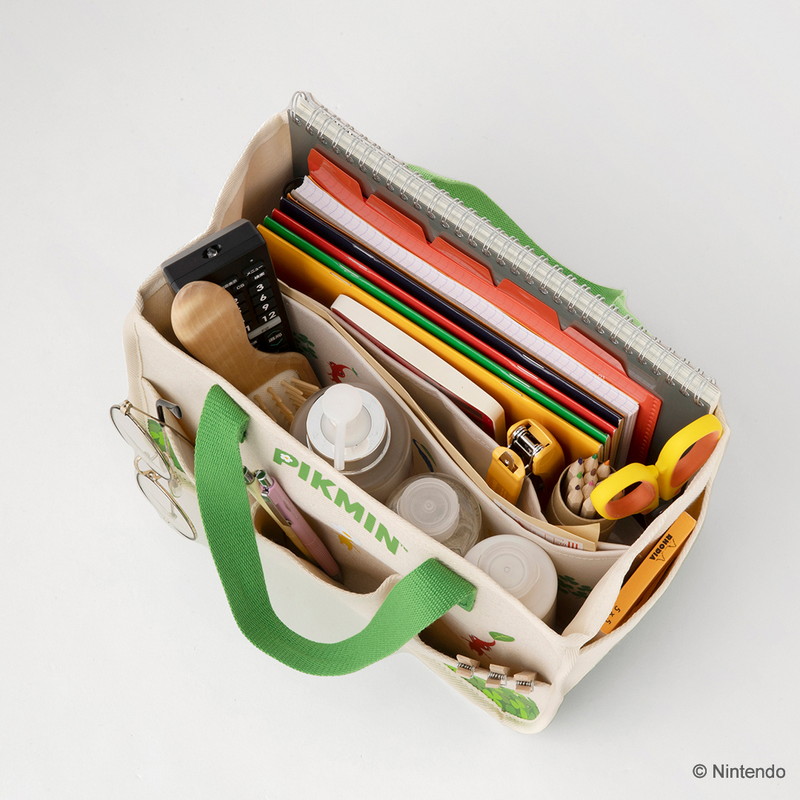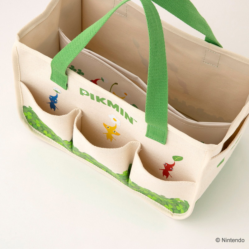 バッグのデザインは持ち運びもしやすいナチュラルテイストながら、側面のロゴやポケットの中にはさりげなくピクミンたちがあしらわれています。柔らかい印象を与える生成り生地にベストマッチした色合いで、お部屋やオフィス、車の中など、小物収納をしたいときにぴったりのバッグです。