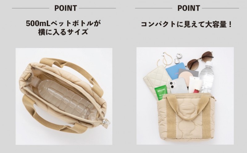 長財布、500mLのペットボトルも入る、ちょうどいいサイズです。お洒落で使いやすいキルティングバッグは、この秋冬大活躍間違いナシ。