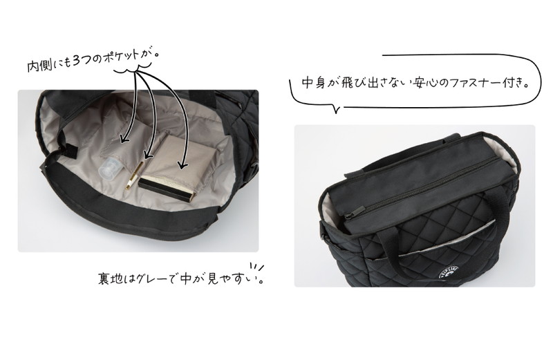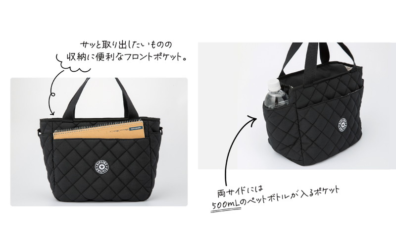 ふんわり軽い素材のキルティングバッグは、6つのポケット付きで整理整頓に便利。