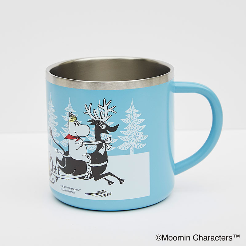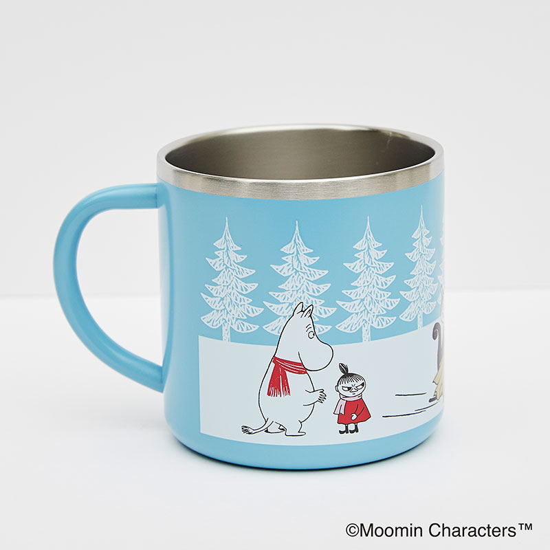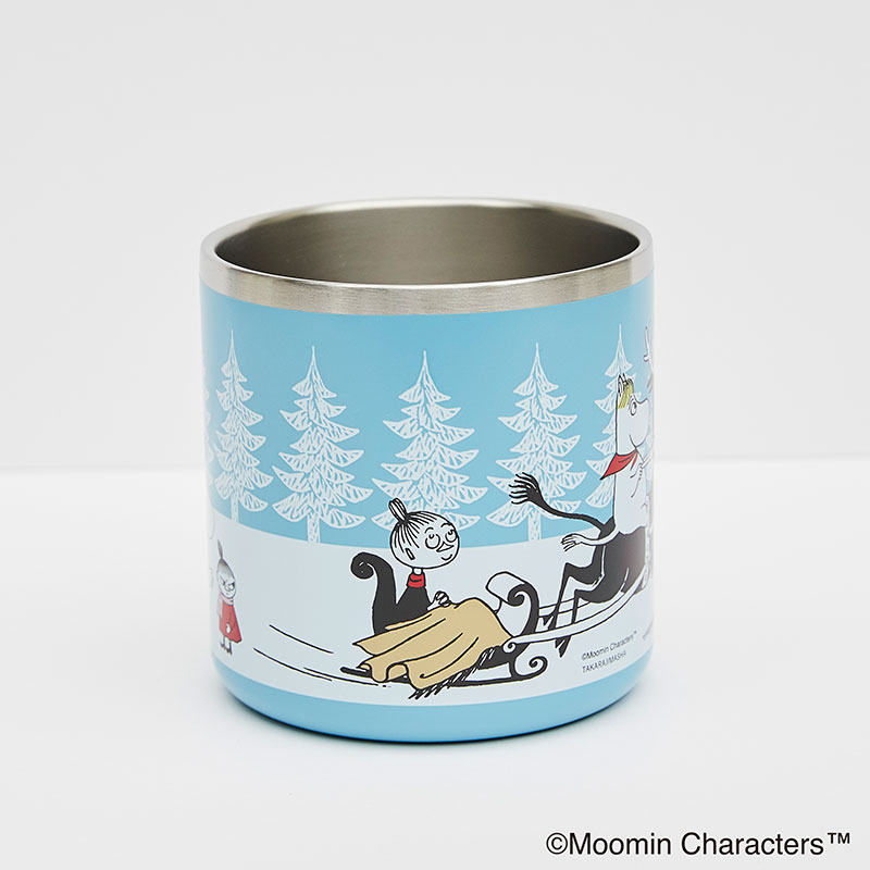 淡いブルーをベースに、雪あそびを楽しんでいるようなムーミン谷の仲間たちのアートがかわいい♪
