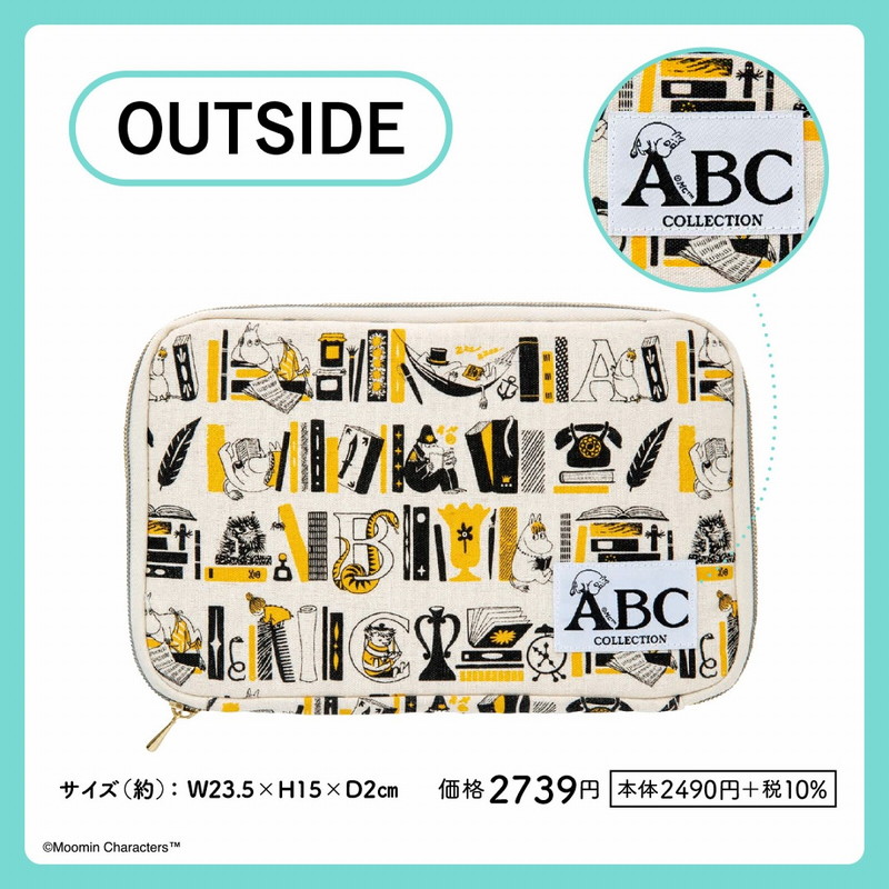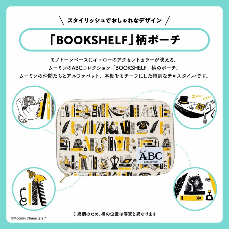 モノトーンベースにイエローのアクセントカラーが映える、ムーミンのABCコレクション「BOOKSHELF」柄のポーチ。ムーミンの仲間たちとアルファベット、本棚をモチーフにした特別なテキスタイルです。スタイリッシュでおしゃれなデザインだけでなく、機能性も抜群!