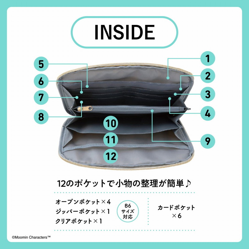 カードポケットが6つ、さらにB6サイズもすっぽり入るポケットが6つ、あわせて12のポケットで小物やカード、お薬や文房具などの整理が簡単に! まさに“マルチ”に使える便利なポーチです。
