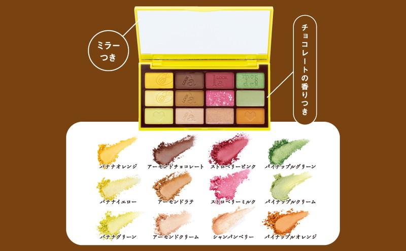 実際のルックのように「バナナ」「アーモンド」「ストロベリー」「パイナップル」の個性豊かな4つの味わいに合わせ、こだわり満載の12色を作りました。