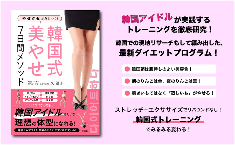 ダイエット初心者やコロナ禍でなまった体でも実践しやすいように考案した韓国式トレーニングをはじめ、韓国で取り入れられているダイエットによい食べ方や生活習慣を紹介しています。