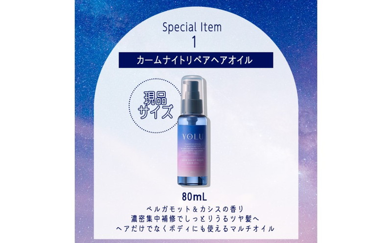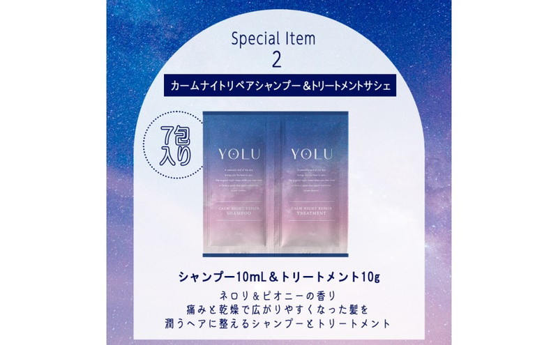 スペシャルアイテムは、大人気のカームナイトリペアシャンプー(10mL)・トリートメント(10g)のサシェが各7包、リラックスナイトリペアシャンプー(10mL)・トリートメント(10g)のサシェが各7包、現品サイズのカームナイトリペアヘアオイル(80mL)が1本の本誌限定の豪華セットです。