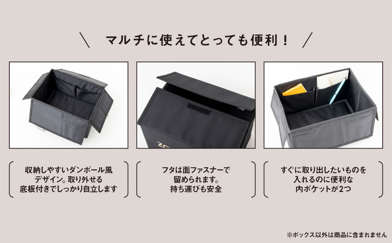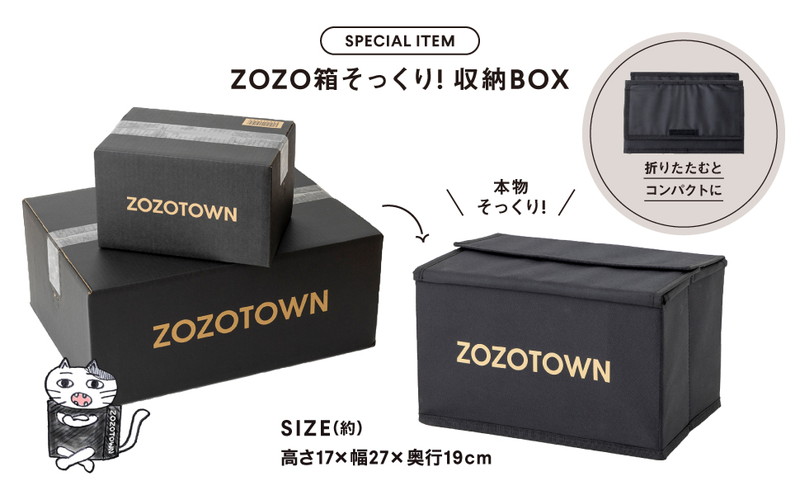 スペシャルアイテムは、ZOZO箱そっくりの収納ボックス。ダンボール風デザインで、底板を取り外すとコンパクトに折りたためます。