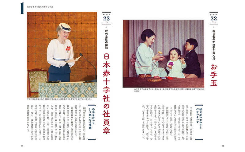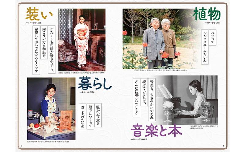 米寿を迎えられた今もお元気で暮らしておられる美智子さま。重責を担いながら、国民に笑顔で接してこられた力となった愛用品、思い出の品を、米寿にちなみ88個紹介します。品々にまつわるエピソードを多数掲載。ほかにも美智子さまが愛する場所をその写真、思い出とともに紹介しています。美智子さまの愛用した日常品から音楽・楽器、周囲へお心配りされた装いのアイテムまで、美智子さまのやさしいお人柄がわかる一冊です。