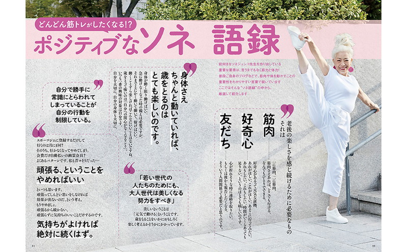シニアの筋トレをテーマに、気になる尿もれや、お尻下のシワ、丸まる背中などのお悩みを解決する、ゆるい筋トレを紹介する一冊です。普段、体を動かしていない人にも取り入れやすいように、動きはとにかく簡単に。自身も70歳であるソネジュンコ先生の指導のもと、続けやすく、いつまでも健康で元気に、長生きできる体をつくる動きを紹介します。