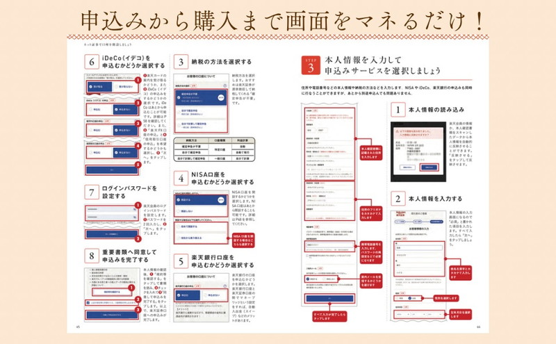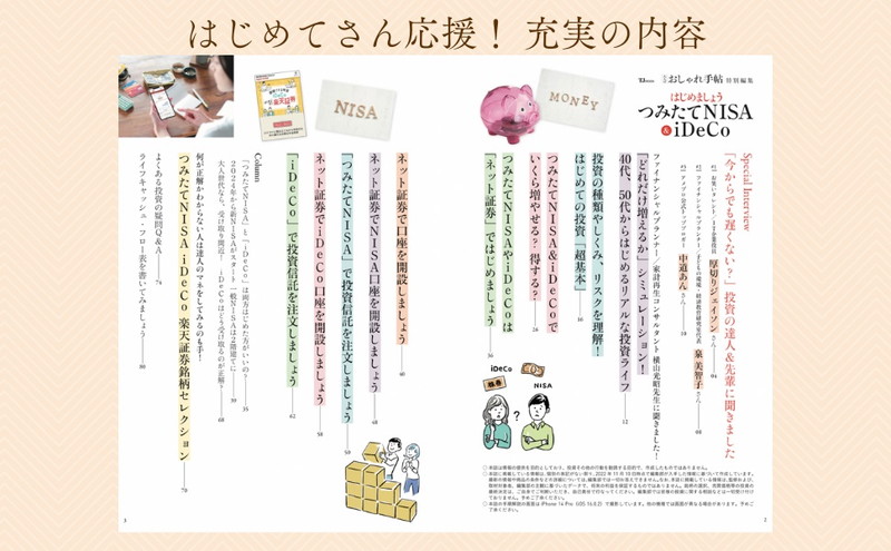 ただ貯金していてもお金は増えない今、iDeCoやつみたてNISAを始める人が増えています。「大人世代の今からでも、iDeCoをはじめたほうがいい?」「私もはじめてみたいけど、一体何から手をつけたらいい?」本誌は、そんな大人世代の背中を押す、誰でも簡単に投資の第一歩を踏み出せる入門書です。ネット証券会社で口座を開設し、iDeCoやつみたてNISAをはじめるまでの流れを、大きな文字・大きな画面でわかりやすく解説します。