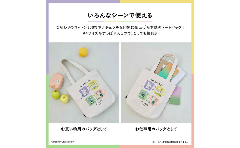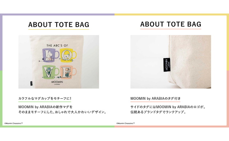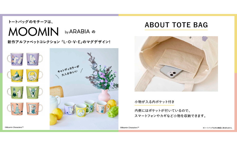 バッグのデザインモチーフは、2022年冬に登場した「MOOMIN by ARABIA」の新作デザイン、「アルファベットコレクション」。その記念すべき第1弾としてリリースされた「L」「O」「V」「E」モチーフのマグカップは、4つそろえると「LOVE」に。アルファベットとともにムーミンママ、ムーミン、ロッドユール、ミムラがそれぞれ描かれた、キャンディーカラーの大人かわいいマグデザインが、素敵なトートバッグになりました。