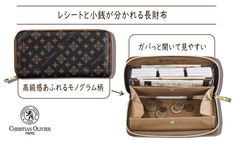 誌面では人気のモノグラムバッグの新色を紹介します。スペシャルアイテムはレシートと小銭が自動で分かれる機能的な長財布。じゃばら式カードポケットも付いている、使いやすさを重視した仕様です。金運アップカラーを考慮したデザインで、おしゃれ感たっぷりのオリジナルブラウンカラー。プレゼントにも最適です。