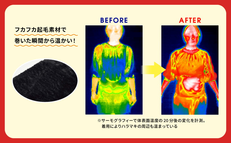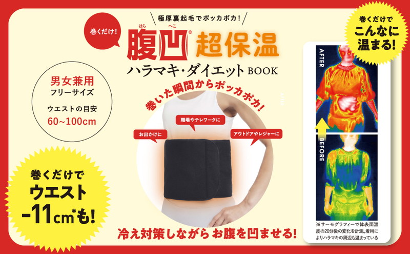 竹内しのぶ先生監修の「腹凹(R)ハラマキ」シリーズに、最強クラスに暖かい新商品が登場。内側の全面が厚手でフカフカの起毛素材になっていて、巻いた瞬間からポッカポカ。とっても保温性の高いベルト状のハラマキです。お腹からしっかり体を温めて血行を促す効果と、巻くことでポッコリお腹をスッキリさせる効果、そしてベルトのサポートで筋肉を正しく動かし、日常生活でインナーマッスルを鍛えお腹を凹ませるダイエット効果がトリプルで期待できます。