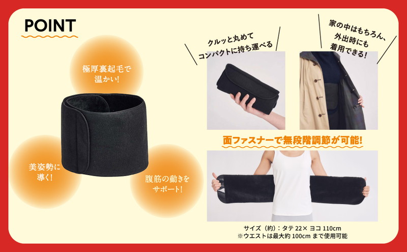ハラマキは無段階調節が可能で、100cmまで老若男女・体型を問わず幅広く使用可能。シンプルなブラックカラーなので、家の中ではもちろん、冬のアウターの下にもさりげなく着用でき、真冬の防寒対策にも活用できます。テレワーク、オフィスやお出かけ、アウトドアやレジャーなどで活躍。巻いて過ごすだけで、冷え対策をしながら日常生活がお腹を凹ませるエクササイズに!