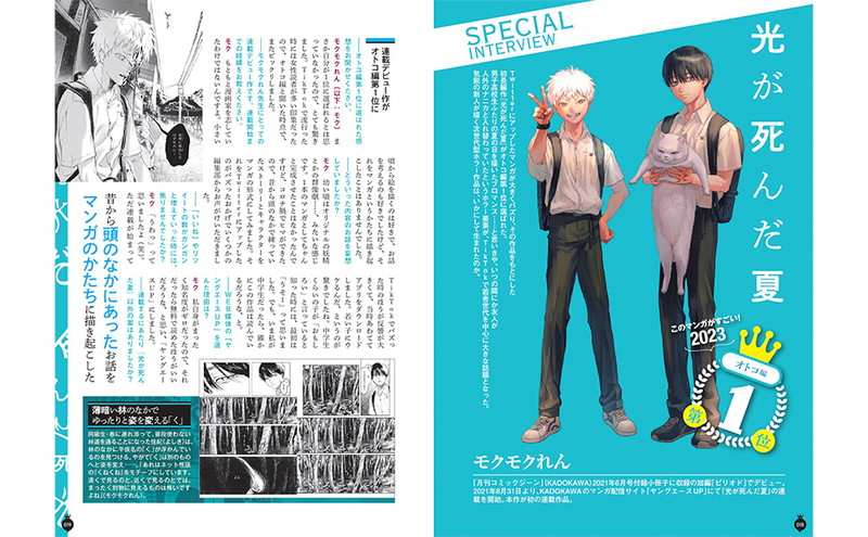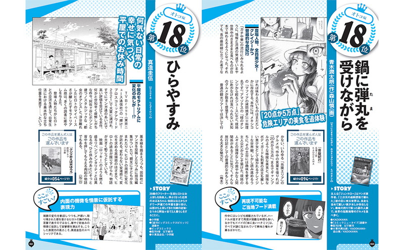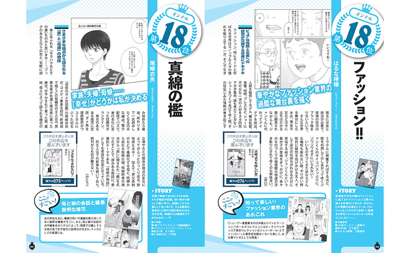 オトコ編/オンナ編TOP50位まで、全100作品のレビューページをはじめ、昨年版でTOP20にランクインした人気漫画家の皆さんや、担当編集者が注目している作品も紹介します!