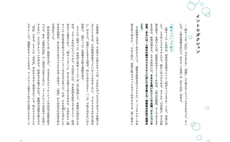 この一冊が、あなたの胸キュンを考える「きっかけ」や「たたき台」になればと願っている。そんなシンプルな想いがすべて。そこに、作品の視聴者はもちろん、胸キュンを考えてみたい方、シーンを深く観るのが愉しい方、あるいは作り手になろうという方も、広くふくまれたら素敵だ。