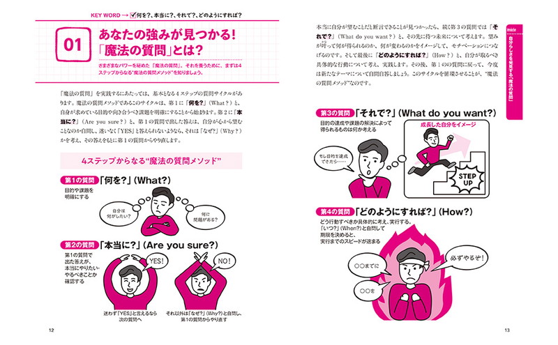 著書累計は54万部を突破! 『質問は人生を変える』(きずな出版)、『365日の質問』(光文社)などのベストセラーを出しているマツダミヒロさん考案の“魔法の質問”をテーマにした「見るだけノート」です。「今日、絶対にやりたいことは?」「叶えたいことに近づくために、今日できることは何?」のような質問を自分に問いかけることで、自己分析、自己理解、未来をイメージする、自己啓発書です。著者が考案した「理想の自分になるための魔法の質問」を、イラストと共に解説していきます。