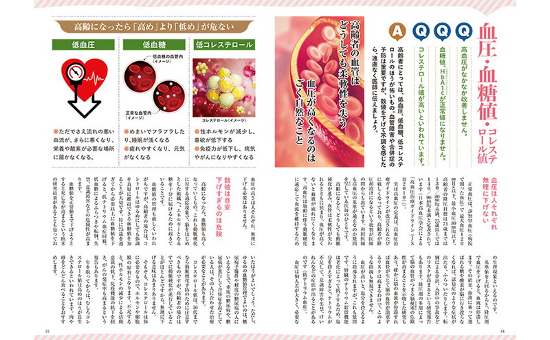 テレビの健康番組を見て、日々、健康のために努力されている方も多いのではないでしょうか? しかし70代、80代では、健康常識は変わってくるのです。コレステロール値は低いより高いほうがいい、血圧は多少高くても薬を飲まない、運転免許証は返納しない、ダイエットはしない、粗食はNG……それまでの健康常識はいったん捨てて、老化を防いで、生き生きと年を重ねるための新しい考え方にシフトする必要があります。本誌では、70代、80代、90代で、どのように日常を過ごしていくのがよいのか、高齢者医療を専門とする名医がわかりやすく解説します。