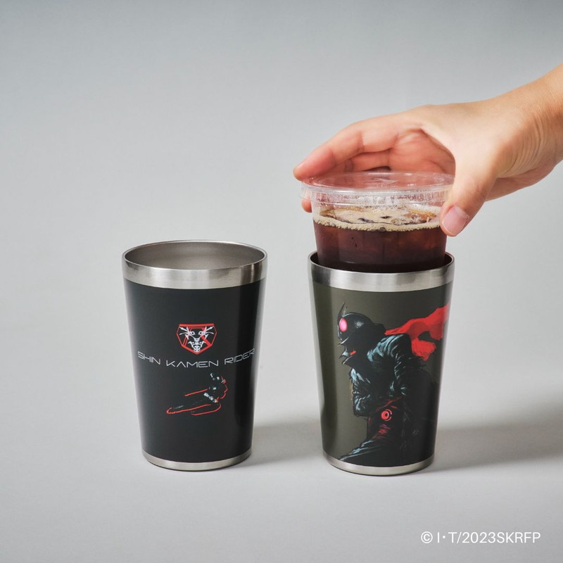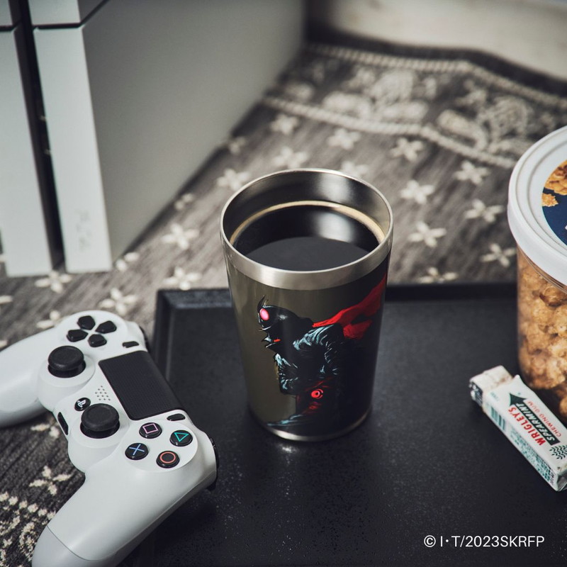 庵野秀明監督の最新作・映画『シン・仮面ライダー』の2023年3月公開を記念した、大人シックなブラックデザインの真空断熱タンブラーです。
