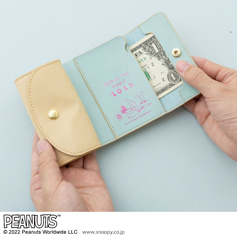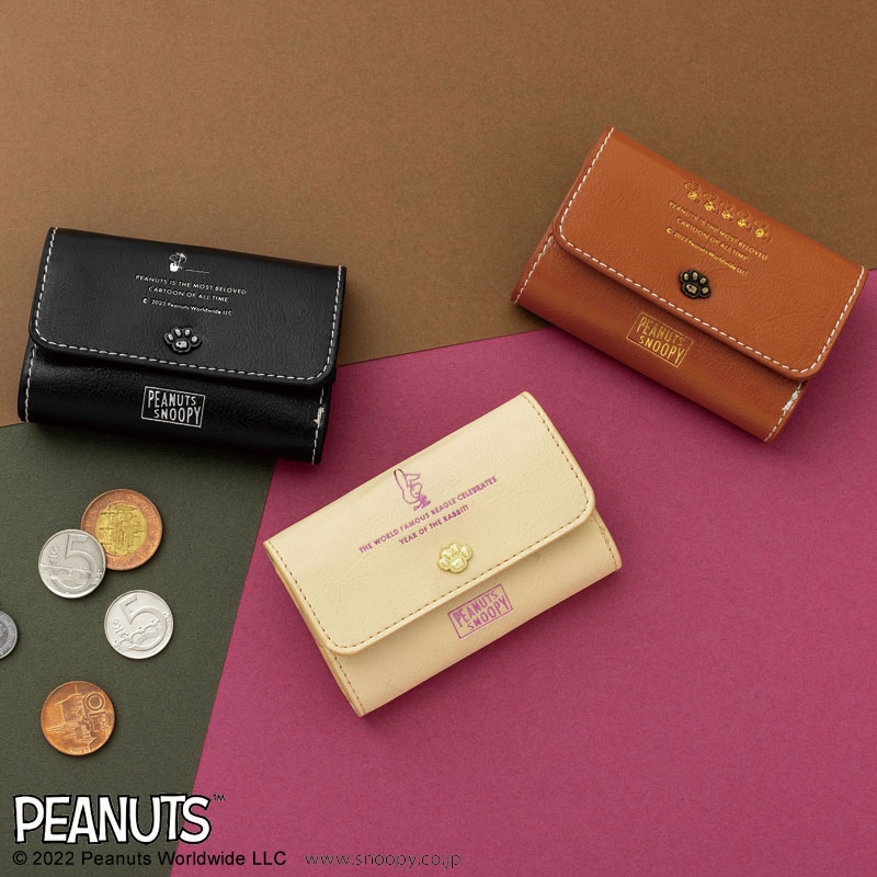 マットなレザー調のボディに、2023年の干支であるうさぎに扮したスヌーピーを型押しで施した、今しか手に入らない限定デザインのミニ財布。