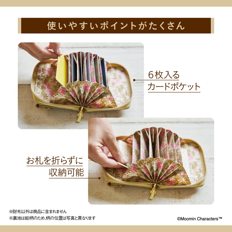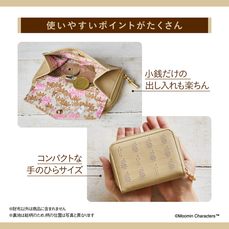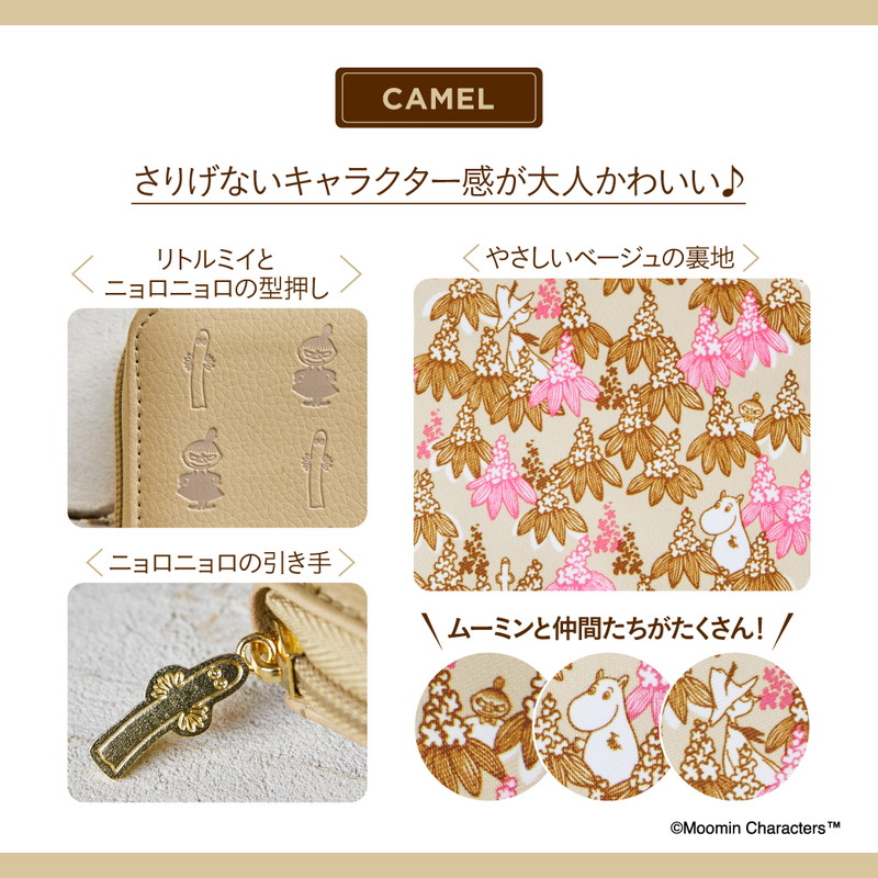飽きのこないナチュラルなキャメルはどんなシーンにもピッタリ。リトルミイの型押しやニョロニョロの引き手、やさしいベージュカラーの総柄の裏地など、さりげないムーミンデザインのおしゃれさもポイントです。