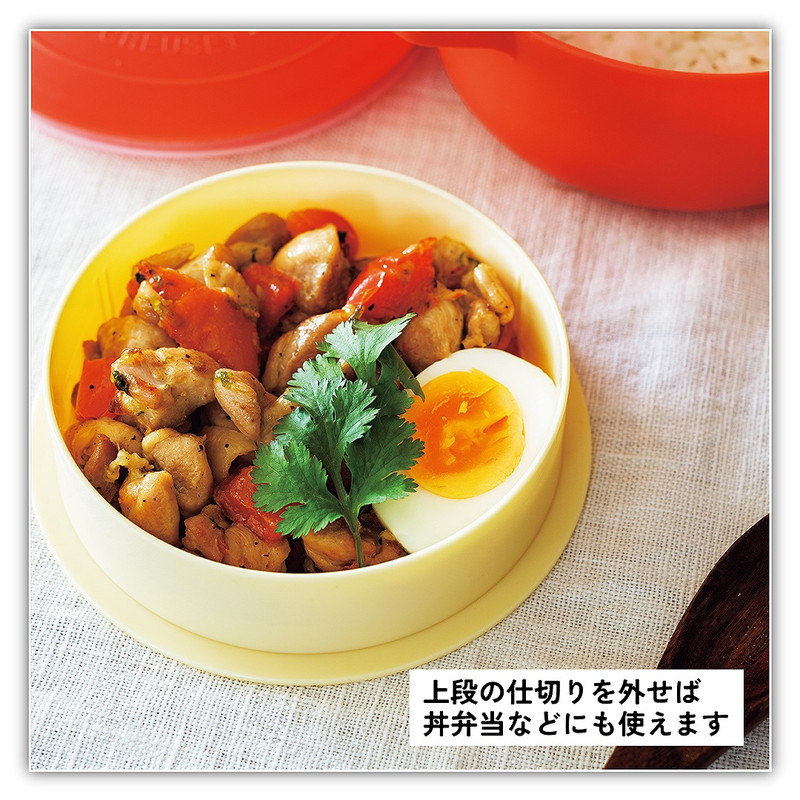 2段構造で、上段には味移りがしにくい仕切り付き。外ブタ、内ブタを外せば、電子レンジOKで、見た目も機能性も大満足なお弁当箱です。