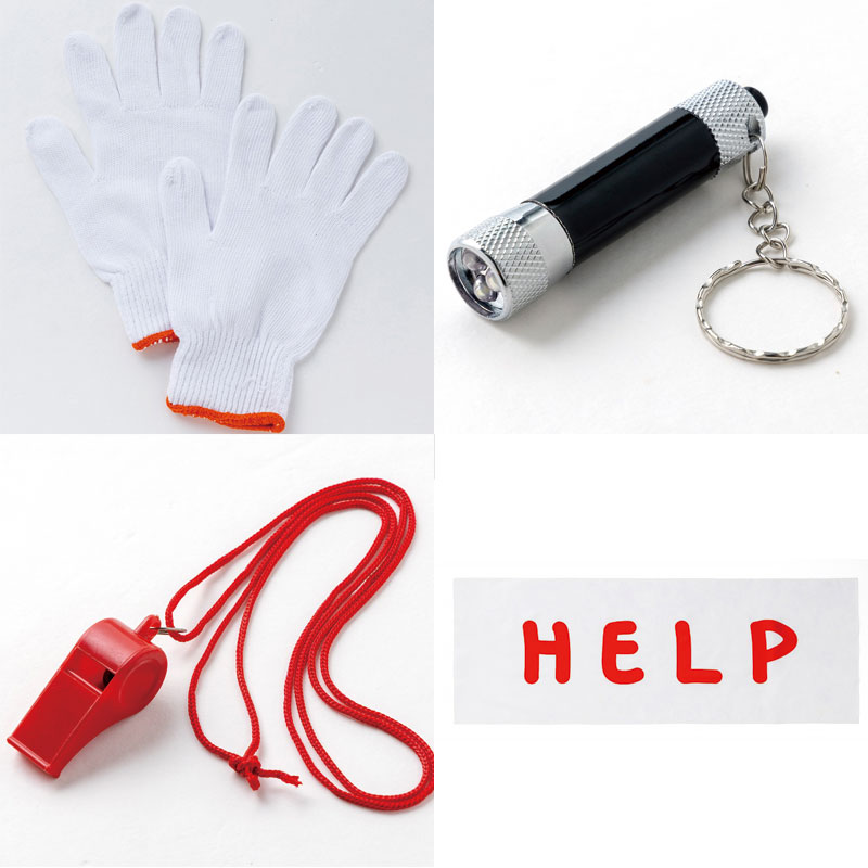 軍手、ライト、ホイッスル、アルミブランケット、HELP文字がプリントされた手ぬぐいがボトルに収納されています。