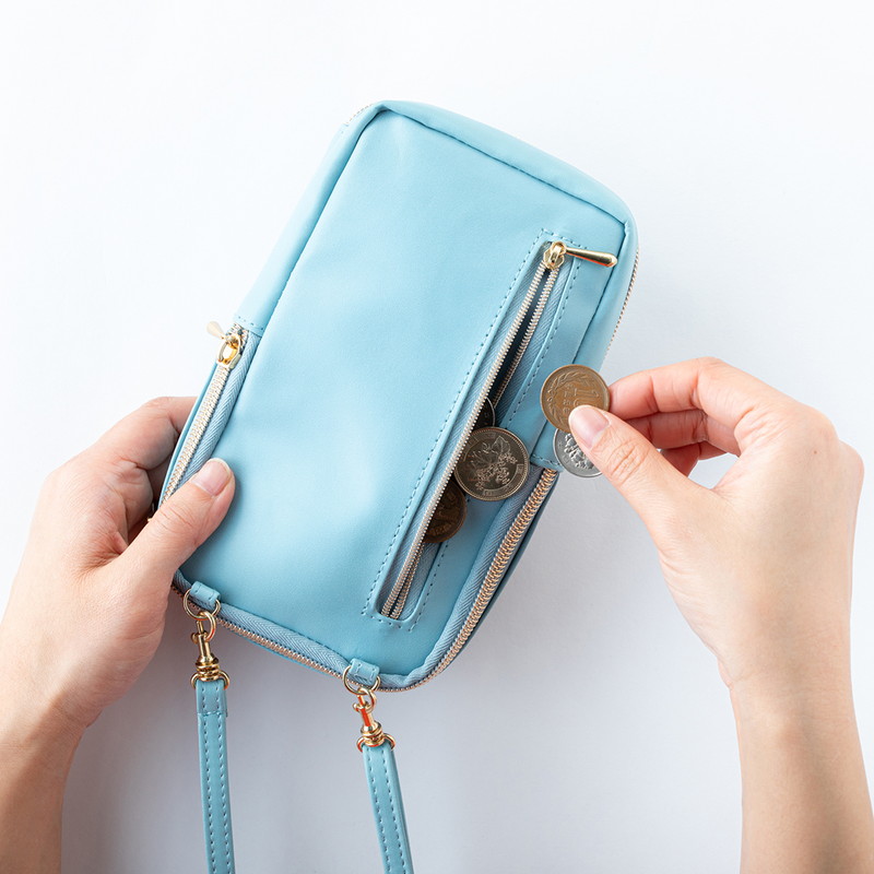 コンパクトなサイズ感ながら、充実した収納機能が付いています。フロントポケットの内装にはクリアポケットが付いているので、好きなアイドルやキャラクターの写真を入れれば自分だけのオリジナルバッグが作れます! お札や小銭を入れるポケットも内蔵しているので、このバッグ一つで身軽にお出かけできるのもポイントです。爽やかなブルーが毎日のコーデのアクセントになります。