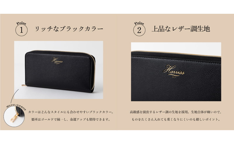 カラーはどんなスタイルにも合わせやすいブラック。要所はゴールドカラーで統一し、金運アップも期待できます。