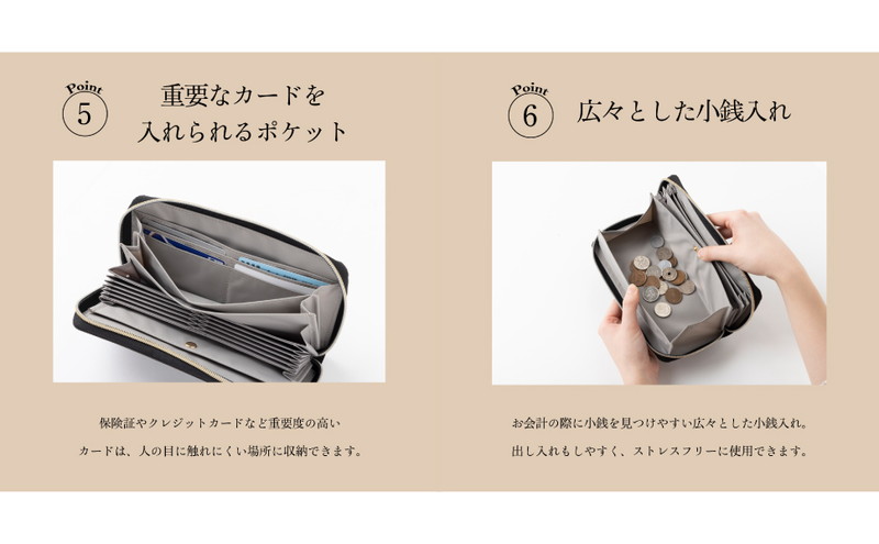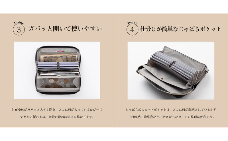 財布全体がガバッと大きく開き、どこに何が入っているかが一目でわかる優れもの。会計の際の時短にも繋がります。