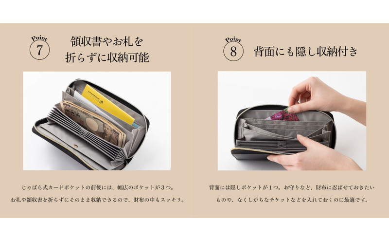 じゃばら式カードポケットの前後には、幅広のポケットが3つ。お札や領収書を折らずにそのまま収納できるので、財布の中もスッキリ。
