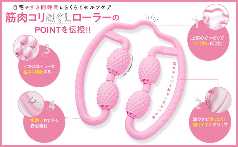 本誌のスペシャルアイテムハンドル型のローラーは、ふくらはぎ、太もも、二の腕などに挟んで、転がすだけでOKです。さらに、肩などのツボ押しも可能です。