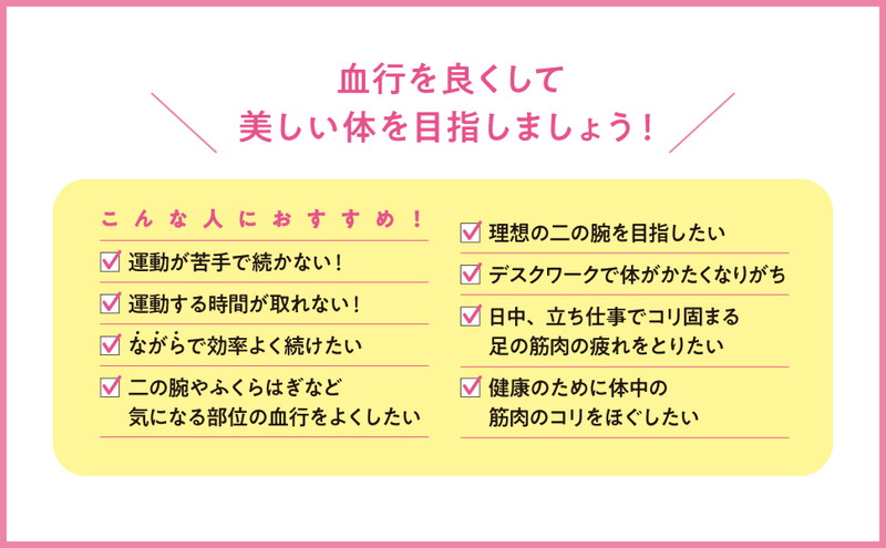 運動が苦手で続かない方、時間が取れない方、ながらで効率よくセルフケアを続けたい方、気になる部位の血行をよくしたい方、デスクワークで体が固くなりがちの方、立ち仕事でコリ固まる足の筋肉の疲れをとりたい方、健康のために体中の筋肉のコリをほぐしたい方などにおすすめです。