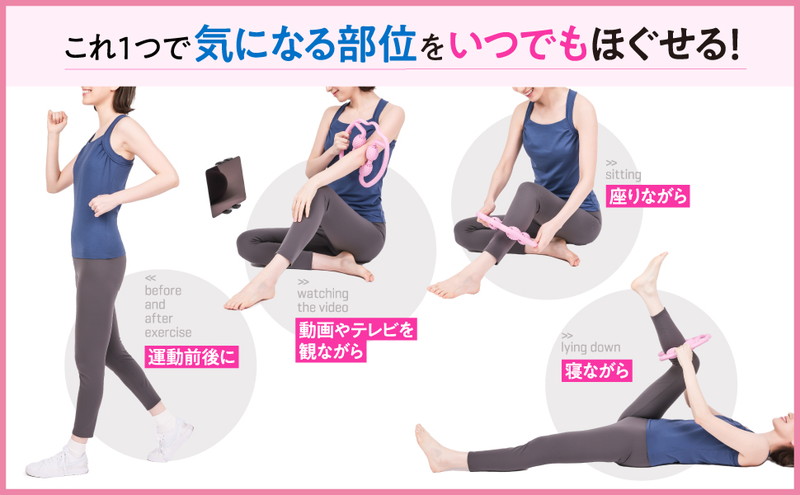 手軽にできるのが特徴で、動画やテレビを観ながら、ゴロゴロしながらなど、いつでも取り入れられます。また、運動前の筋肉のコリほぐし、運動後の筋肉の疲れをとりたいときにも使えます。