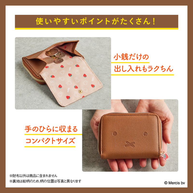 ナチュラルで落ち着いたブラウンカラーにミッフィーのお顔が型押しされた、どんなシーンにも合うシンプルで使いやすいデザインです。ミッフィー型のスナップボタン、いちごのチャームに、ミッフィー&いちご柄が描かれたライトブラウンの裏地など、さりげないかわいさがたくさん詰まったお財布です。
