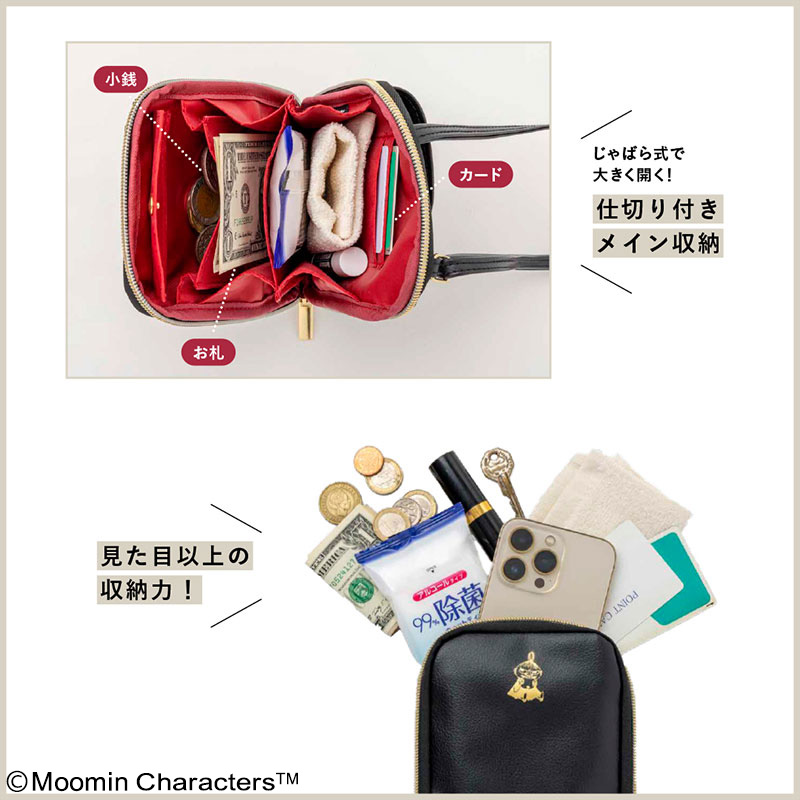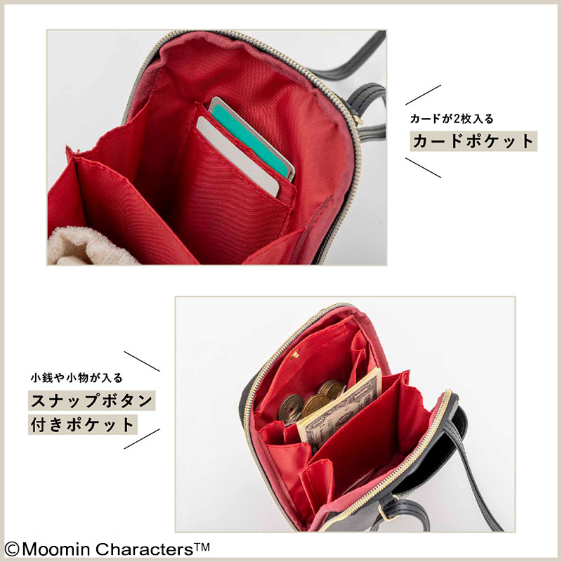 メインの収納は仕切り付きで中身を整理しやすく、ガバッと大きく開けるじゃばら仕様。背面にスマホをサッと出し入れできるポケットが付いています。内側にはスナップボタン付きの小銭入れと2枚分のカードポケットが付いていて、お財布としての機能もバッチリ備えています。ミニマムな見た目ながら、スマホにお札・カード・小銭、鍵やリップ、ハンカチ、ティッシュなど外出に必要なものがしっかり入るので、これひとつでお出かけできます♪