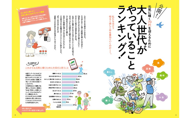元気な70代を迎えるために、明るく生きるシニアがやっている暮らしや生き方のアイデアを紹介。多くのシニアがやっていること、少数意見でもキラリと光るものなど、わかりやすく見せます。実際にやっているエピソードと、具体的な方法を一緒に紹介することで、すぐにでも始められるヒントに。手に取れば、明るくポジティブにまだまだ元気に生きる希望が湧いてくる一冊です。