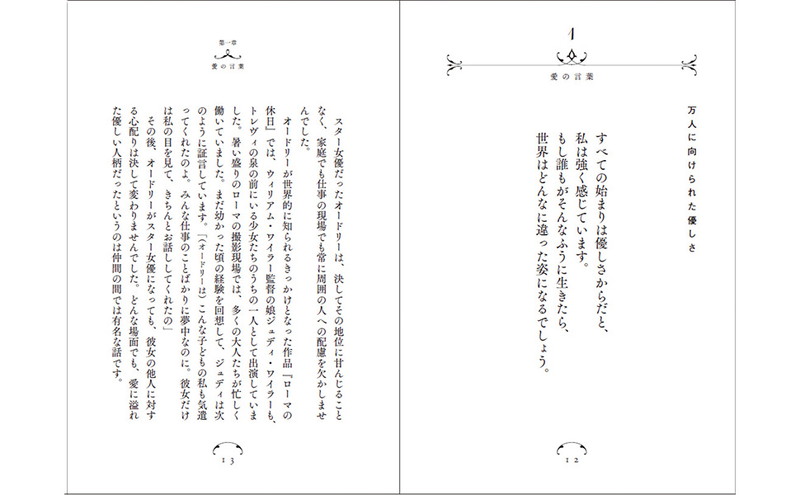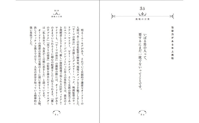 時代を超えて、世代を問わず愛されるオードリーのような女性はいません。本書はオードリーの言葉の決定版です。いつも気丈で前向きな彼女の生き方は、女性だけでなく人間として憧れる存在です。美しいだけでなく、謙虚で品格があり、ユーモアもあります。そんな多くの人から愛された彼女の人生観が伝わる言葉や生きるヒントを得られる言葉の数々をご紹介します。