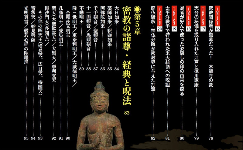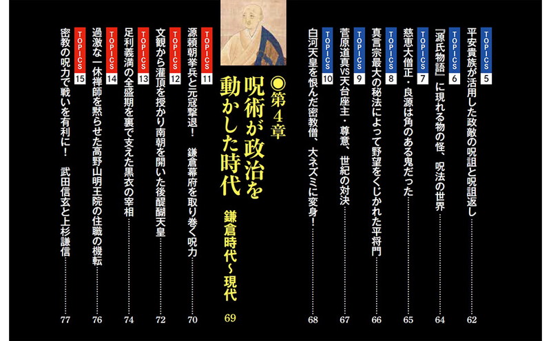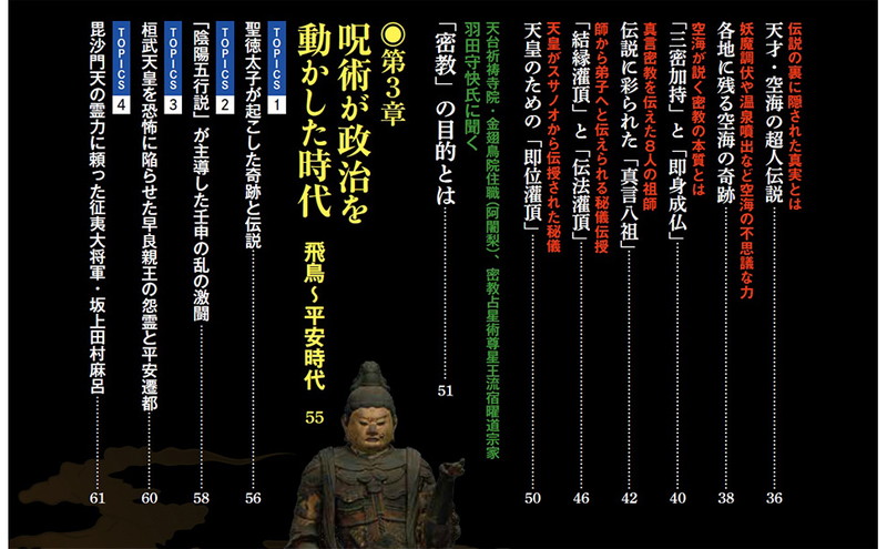 「呪術」への注目が続く今、呪詛の力を駆使して日本の歴史を動かしてきた神秘と謎に包まれた宗教・密教の影響力をたどるムックです。時の権力者たちを陰から支え、あるいは追い落としてきたほどに深く関わってきた密教の姿を、驚きの事件やその奥深い修法の数々とともにたっぷりご紹介します。真言宗の開祖・空海の生誕1250年を迎え、様々な催しが開かれる2023年に、改めて押さえておきたい日本史のアナザーストーリーがここに。
