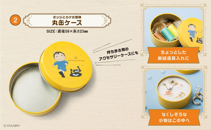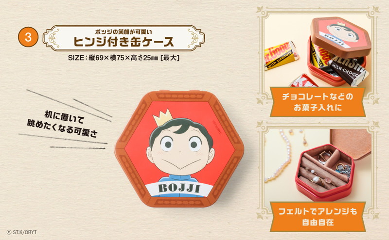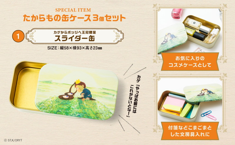 本誌限定アイテムは、ボッジとカゲのイラスト入りのたからもの缶ケース3個セットです。