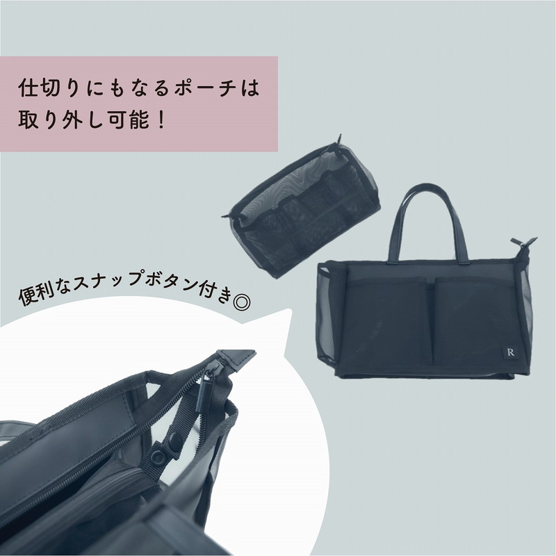 ・中のメッシュポーチはスナップボタン付きで仕切りとしても使えます