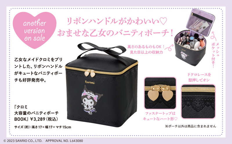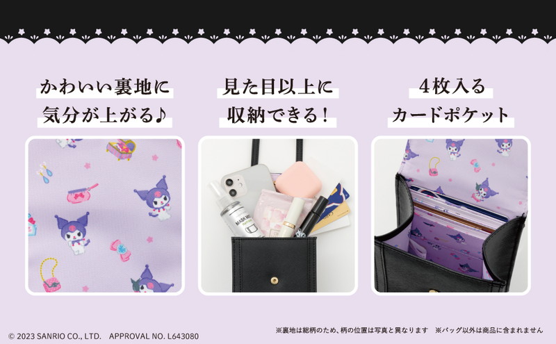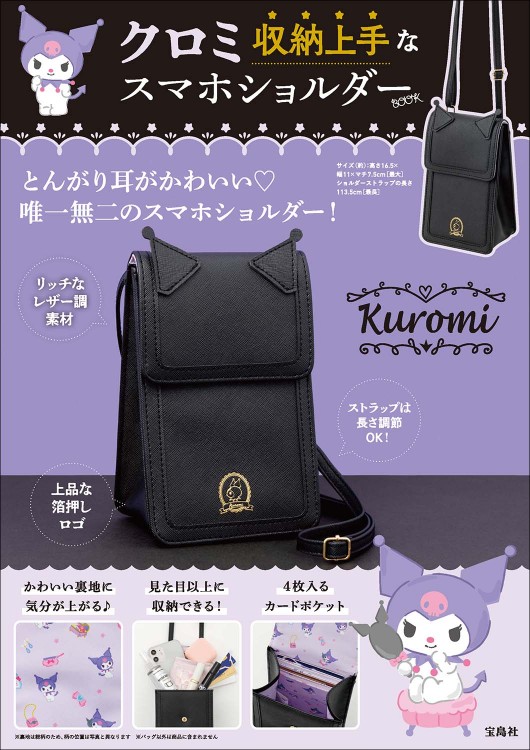スマホはもちろん、リップなどの持ち歩きコスメも入る便利なアイテムです。黒のレザー調素材にクロミの顔をゴールドで箔押しした、シンプルながら高級感たっぷりのデザイン。クロミのトレードマークでもある、ずきんのとんがり耳が付いたフタがこだわりのポイントです。