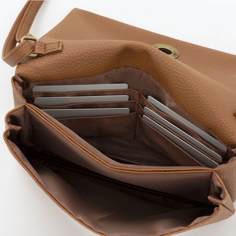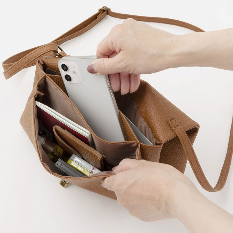 シボ感のあるレザー調素材に、ブランドロゴの型押しが大人っぽいデザインです。仕分けしやすい3層構造、背面ポケット、6つのカードポケットなど、機能性もバツグン。シンプルなショルダーバッグは、シーンを選ばずどんなコーデにもしっくりなじみます。
