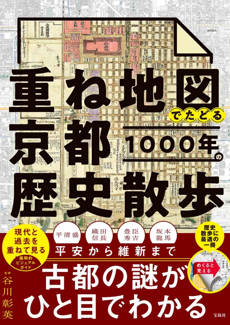 半透明の特殊トレーシングペーパーを使用した重ね地図でたどる、大判の京都・歴史散歩書籍です。