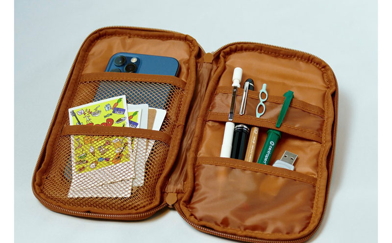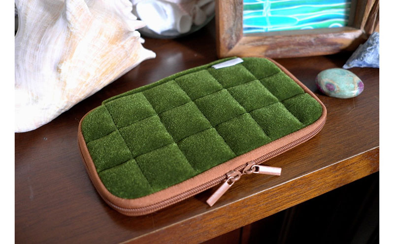 付録はまさかのほんもの素材、モケットグリーンを使用。Kチェアの縫製をイメージしたデザインポーチです。