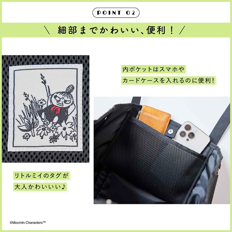 メッシュ素材だから、大容量なのに約200gととっても軽い! 前面・背面は裏地つきで透けなくて安心、サイドはほんのり透けるオシャレな仕様です。どんなコーディネートにも合わせやすいシンプルなブラックに、かわいいリトルミイのタグがアクセントに。